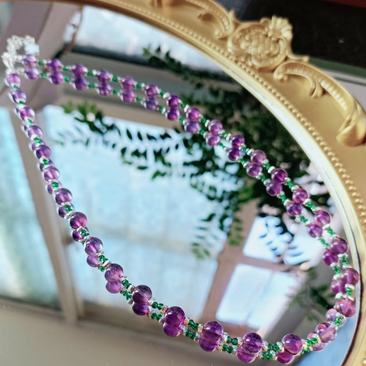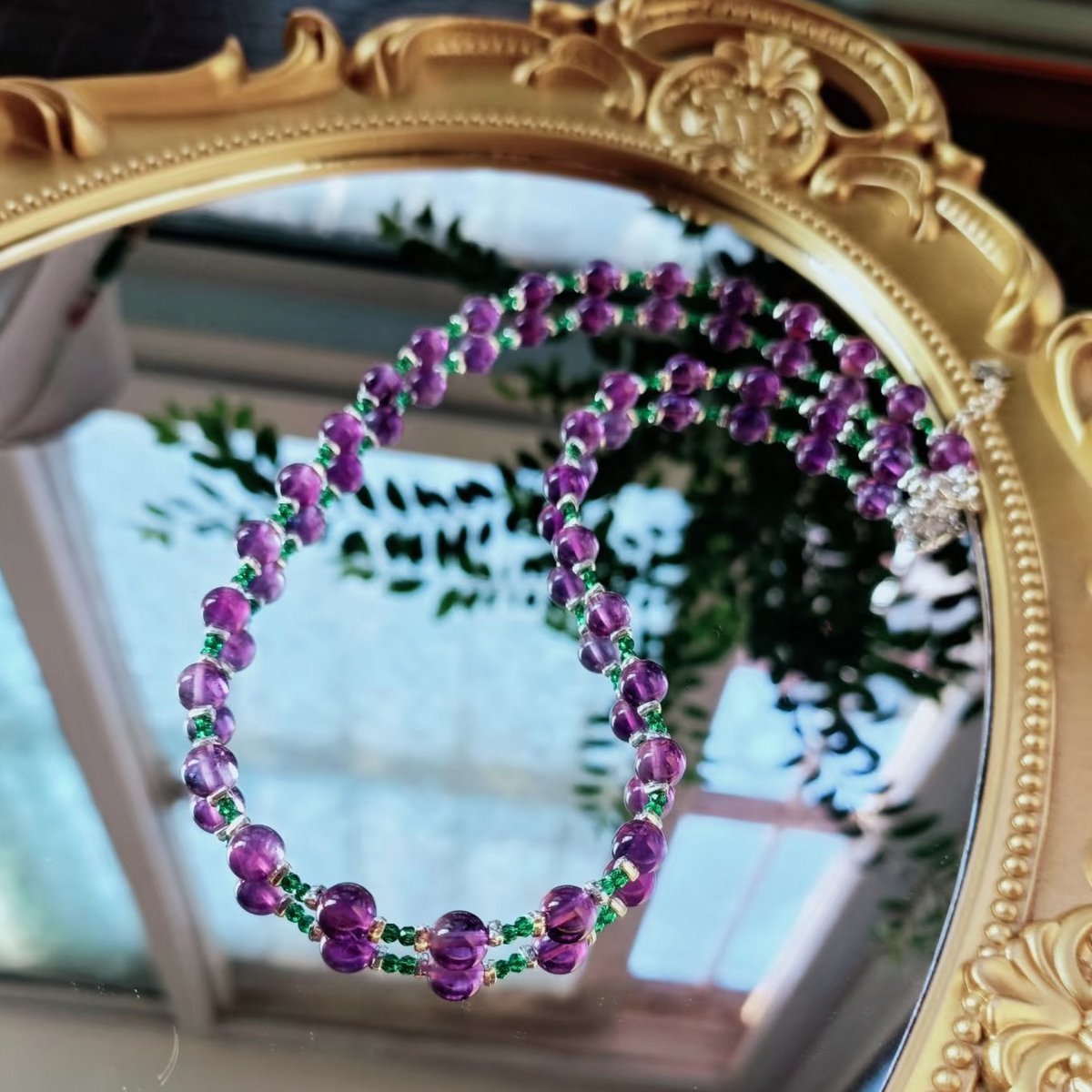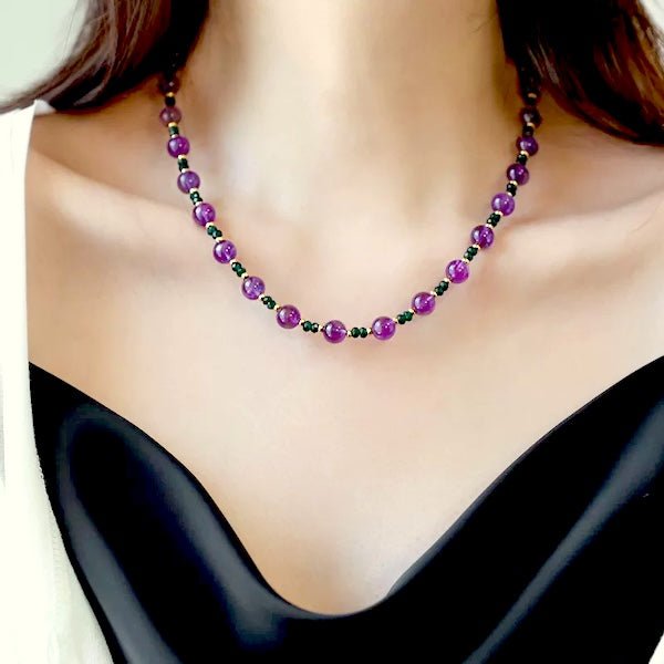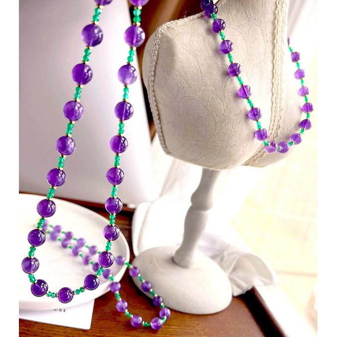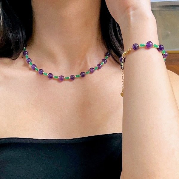 Deze Amethyst en Onyx ketting en armband set heeft een prachtige combinatie van 8 mm amethist - kralen gecombineerd met 2 mm gefacetteerde groene onyx - kralen. Deze opvallende set toont de diepe paars van echte amethist kristallen met het fascinerende groen van de onyx steen.
