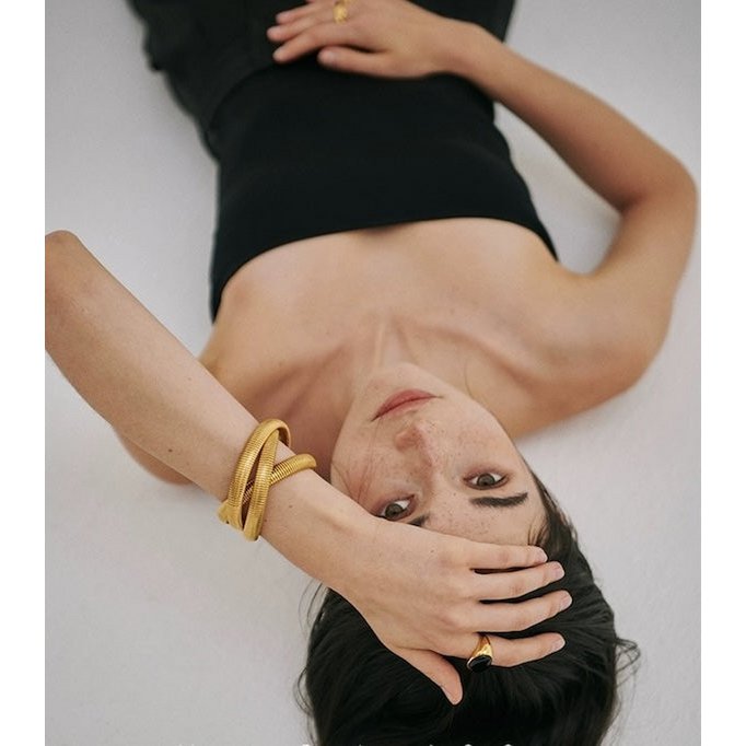 Deze opvallende design armband heeft een rekbaar ontwerp voor een zachte touch en belichaamt de essentie van een minimalistische stijl. Verkrijgbaar in twee chique kleuren – goud en verzilverd op roestvrij staal – past de armband moeiteloos bij zowel casual als formele looks.