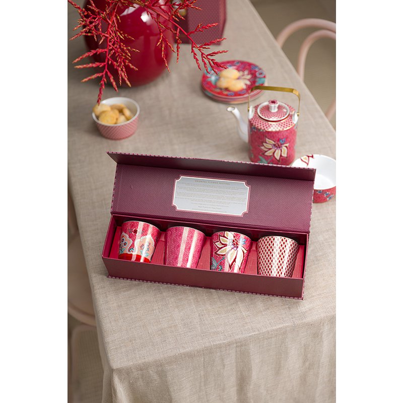 Verras een geliefde of vul je eigen servies aan met deze Flower Festival theemokken. Deze set van 4 verschillende mokken heeft een roze achtergrond en is versierd met het elegante Flower Festival dessin. Dit rijke bloemendessin is opgebouwd uit een variatie van fantasierijke rode en roze chintzbloemen met lichtblauwe en groene bladeren. Met ons Flower Festival porselein zul je jouw servieskast en tafel laten stralen.