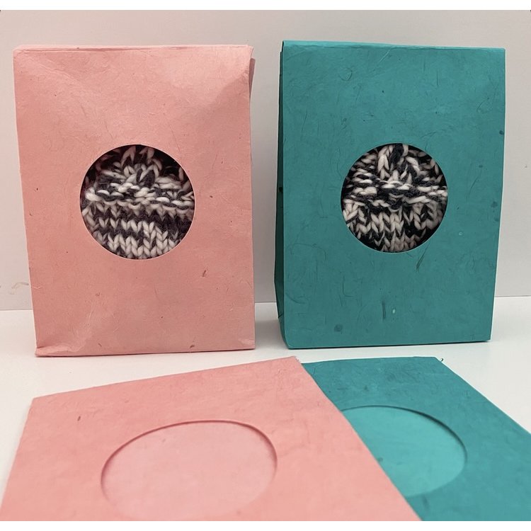 De sokjes zijn voorzien van kleine veters, zodat ze goed aan de voetjes van de baby blijven zitten. De grijze babyslofjes zijn per set verpakt in een gekleurd eco-papieren zakje. Een perfect cadeau voor elke newborn- of babyshower.