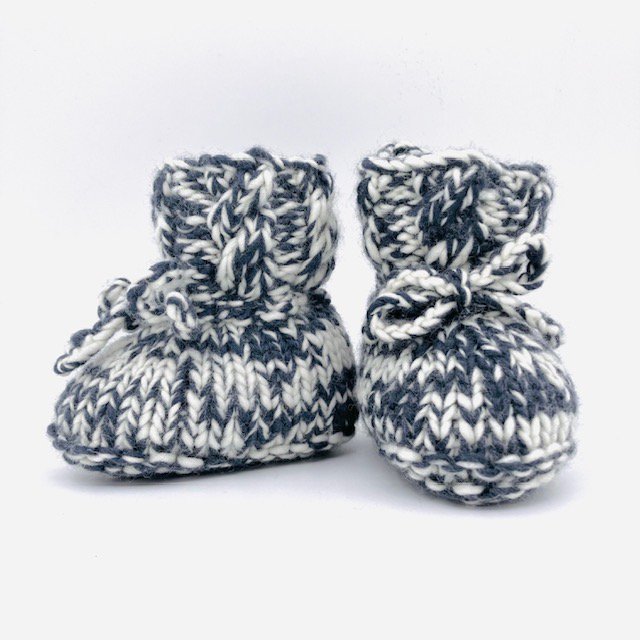 Deze schattige grijs-wit gemêleerde babyslofjes zijn met de hand gebreid van 100% zachte merinowol door onze vrouwen in Kathmandu. Speciaal gemaakt voor de allerkleinsten (0-6 maanden).