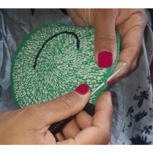 Voor de allerkleinsten: een duurzame platte kikker die een knisperend geluid maakt. In de kleur groen gemêleerd, met de hand gehaakt door onze vrouwen in Kathmandu. Uniek en met liefde gemaakt!