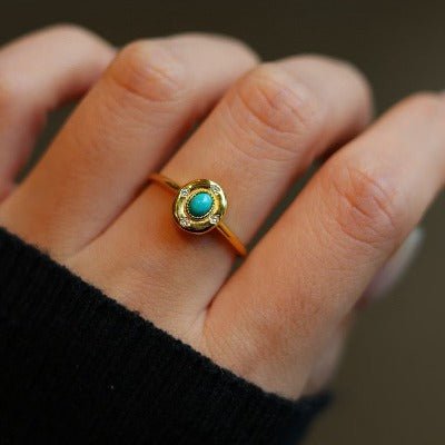 Deze ring met een elegante ovale vorm is gemaakt van goud vermeil, die zowel stijl als flexibiliteit biedt. In het midden ligt een echte turquoise steen, met een fascinerende levendige blauwe tint. De zirkonia stenen zijn zorgvuldig ingelegd in het buitenste gouden frame, waardoor een harmonieus samenspel van schittering ontstaat.