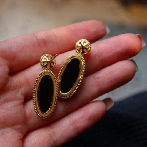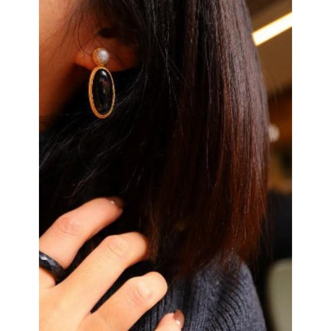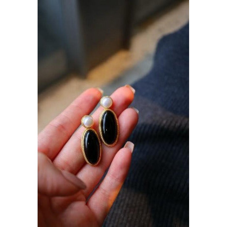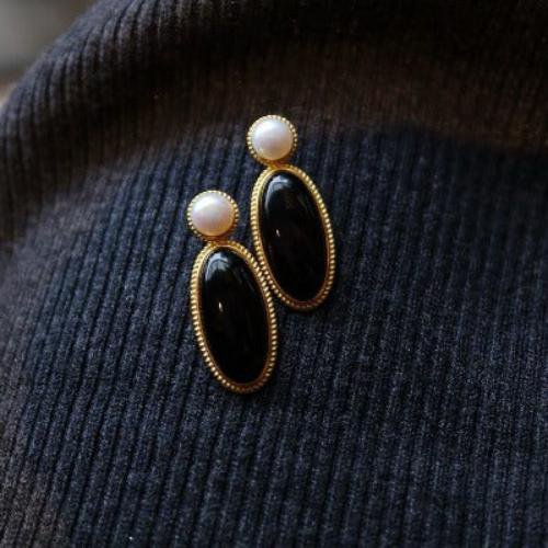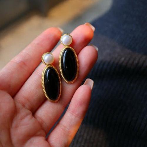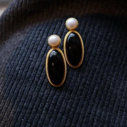 Deze oorbellen zijn vervaardigd met echte zwarte onyx en zoetwater parels. Ze hebben een minimalistische maar moderne vintage look die verfijning naadloos combineert met een vleugje nostalgie. Het gouden vermeil -frame, versierd met een gevlochten lijn, voegt een luxueuze touch toe aan deze oorbellen.