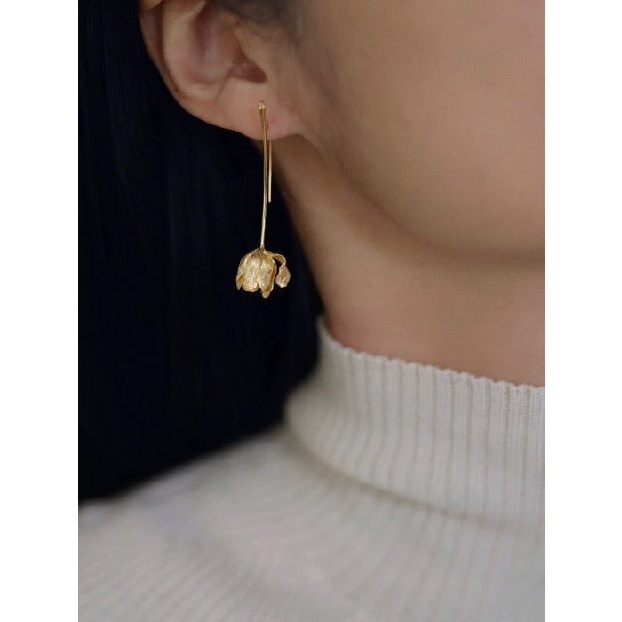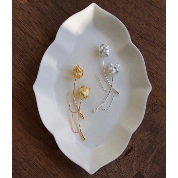 Deze oorbellen hebben een uniek langlijnsilhouet versierd met levendige tulpenbloemblaadjes. Gemaakt van messing en verkrijgbaar in goud- of verzilverde afwerkingen. Het minimalistische en tegelijk stevige ontwerp maakt ze tot een veelzijdige aanvulling op elke sieradencollectie, geschikt voor verschillende looks.