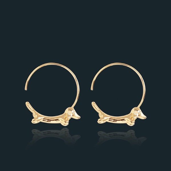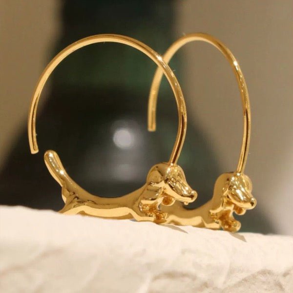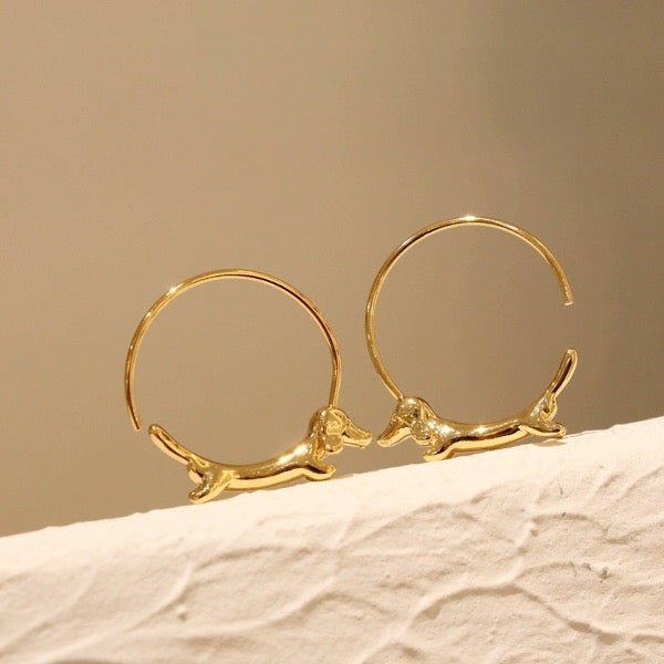 Deze prachtige oorringen hebben een speels ontwerp met een teckel in het midden van de vlucht, wat een speelse en mooie uitstraling uitstraalt. Deze oorbellen zijn vakkundig vervaardigd uit hoogwaardig 18K goud gevuld materiaal en fascineren niet alleen door hun schattigheid, maar beloven ook blijvende elegantie. Het dynamische hoepelontwerp, met een perfecte afmeting van 2,5 x 2 cm, voegt een eigentijds tintje toe en creëert een gevoel van beweging dat moeiteloos de jouw stijl.